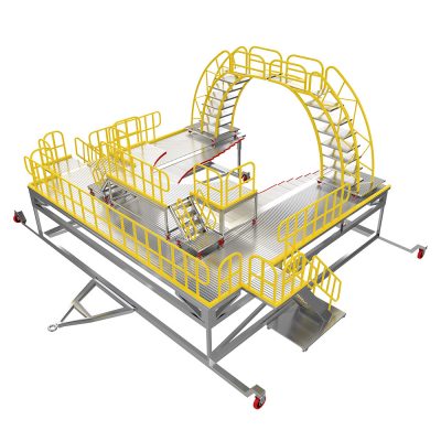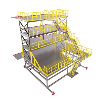 - Steel Access Platforms: These are mobile access platforms fabricated out of mild steel to provide a heavy-duty access solution for various hangar maintenance jobs such as inspection, inner-cowl engine access, sanding, painting, cargo door operation, and cleaning, or carrying out small maintenance jobs.