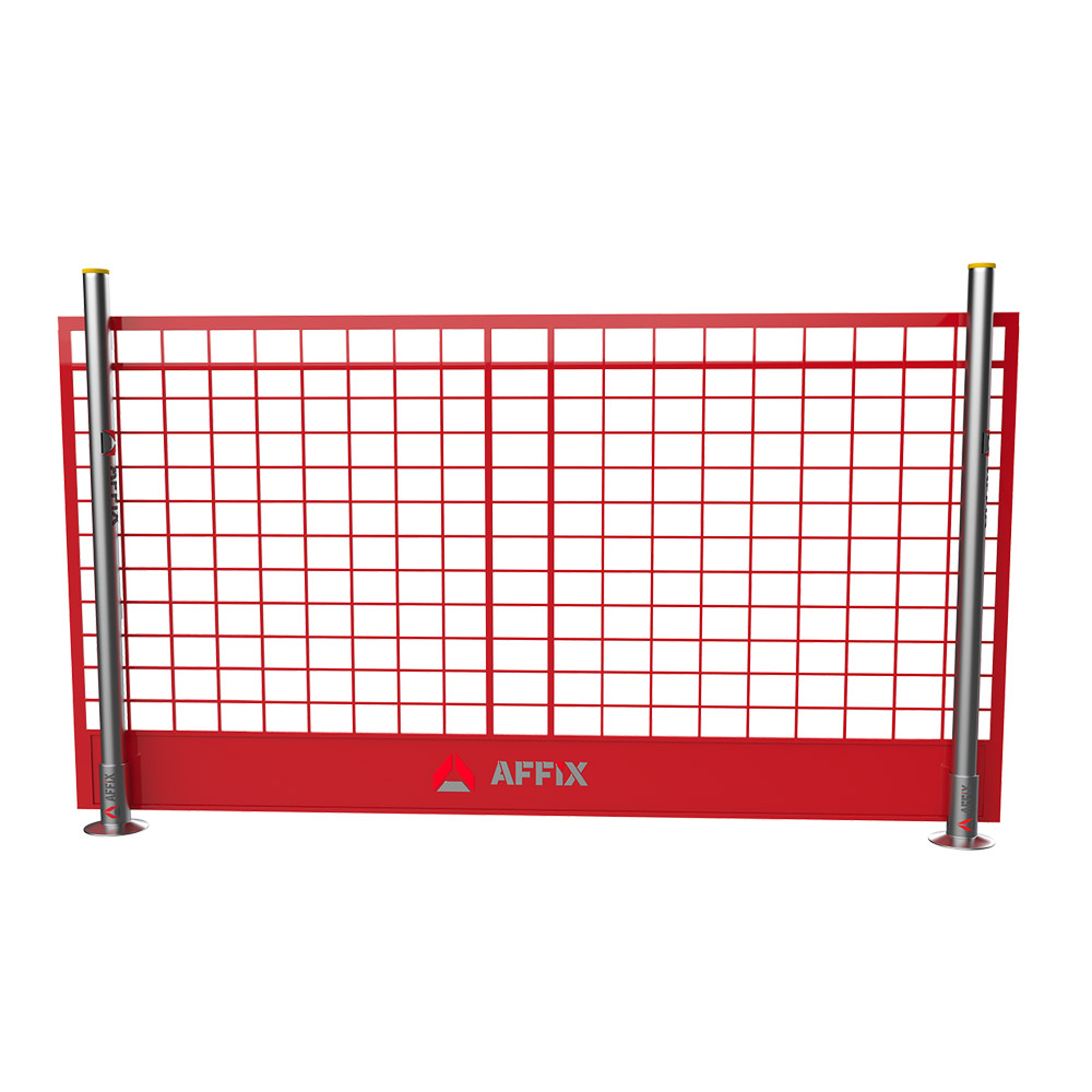 AFFIX Bolt Down Mesh Barrier Edge Protection system comprises of a base with socket, a safety post and a mesh barrier. The socket base is anchored to an anchor which is fixed into the top of the slab by a double-threaded bolt
